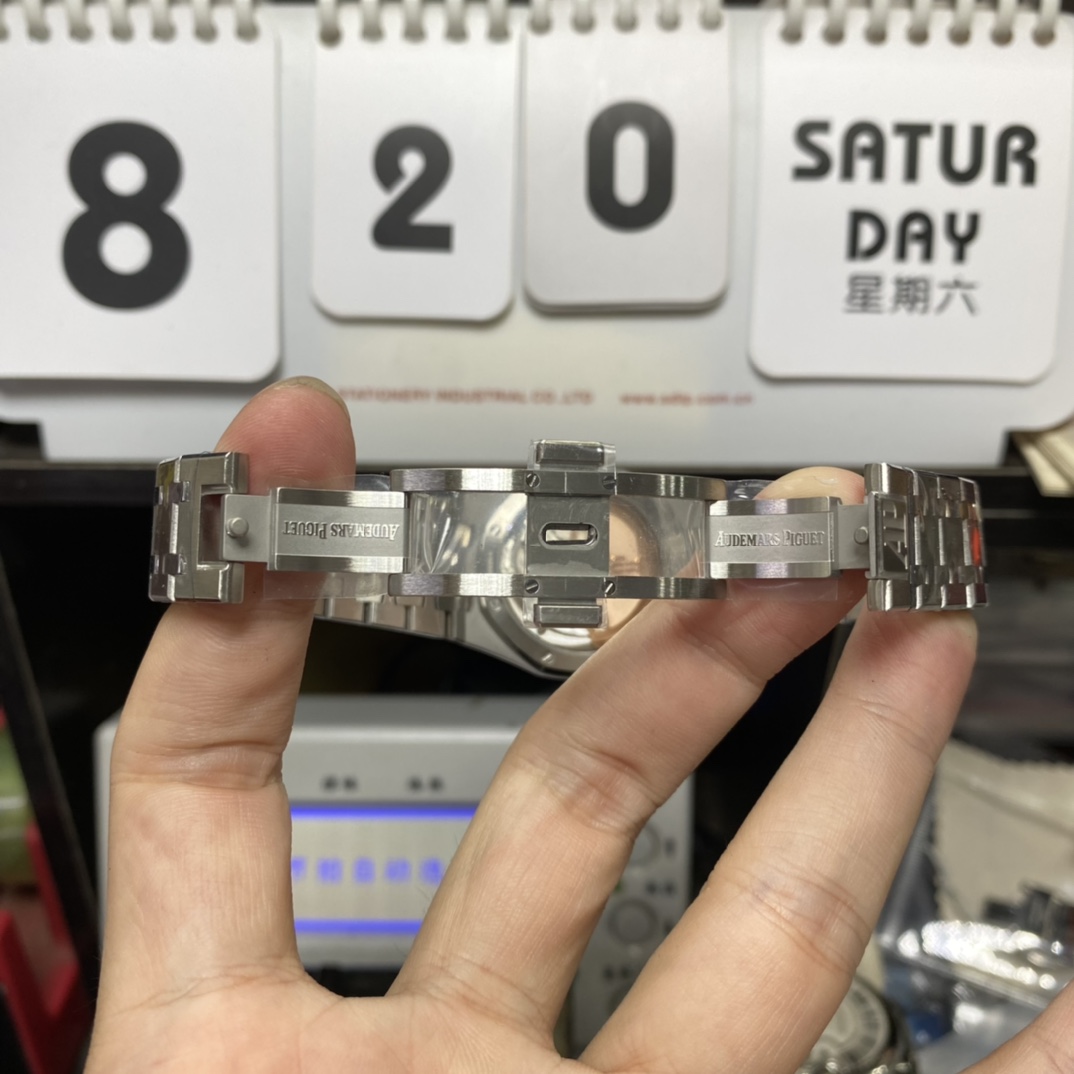 ·Dial Material: "Night Blue, Cloud 50" dial with "Grande Tapisserie" large grid pattern decoration, featuring white gold luminescent applied hour markers and Royal Oak hands.