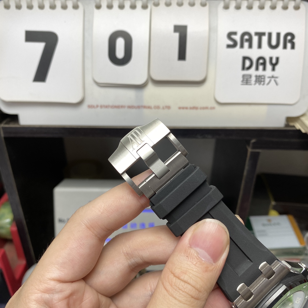·Dial Material: Black Dial with "Méga Tapisserie" Oversized Grid Decoration, Rose Gold Luminescent Applied Hour Markers, and Royal Oak Hands. Black Rotating Inner Bezel with Beige 0 to 15 Minute Zone.