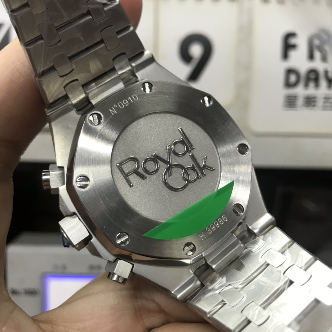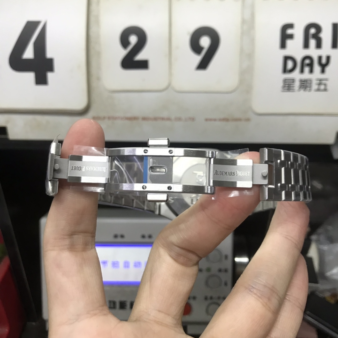 ·Dial Material: Blue dial with "Grande Tapisserie" large grid pattern decoration, featuring a rhodium sub-dial, white gold luminescent applied hour markers, and Royal Oak hands.