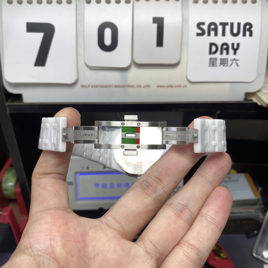 ·Dial Material: Blue dial with "Grande Tapisserie" large grid pattern decoration, featuring a silver sub-dial, white gold luminescent applied hour markers, Royal Oak hands, and a blue inner bezel.