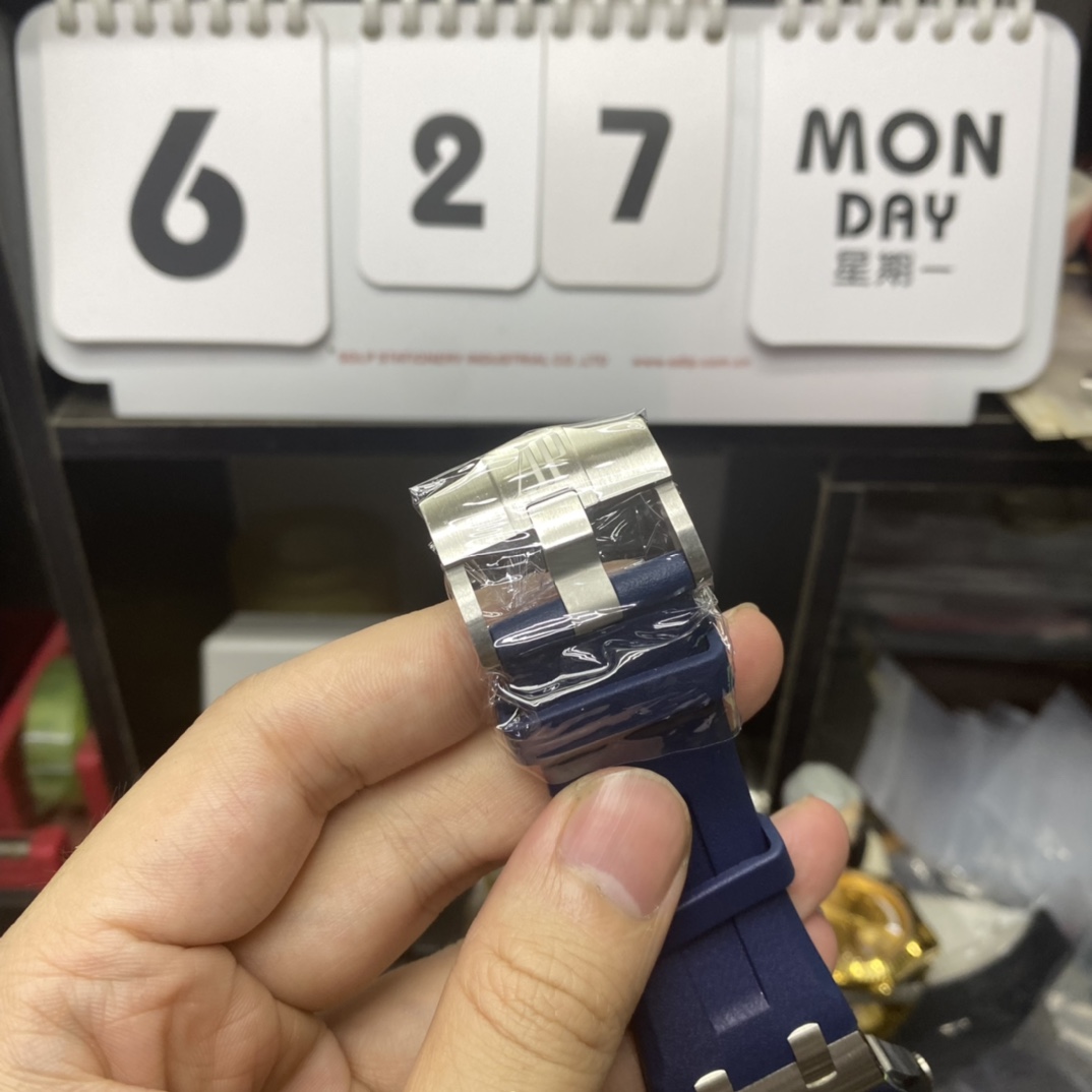 ·Dial Material: Navy blue dial with "Méga Tapisserie" oversized grid decoration, Royal Oak hands, black rotating inner bezel with blue 0 to 15-minute diving scale