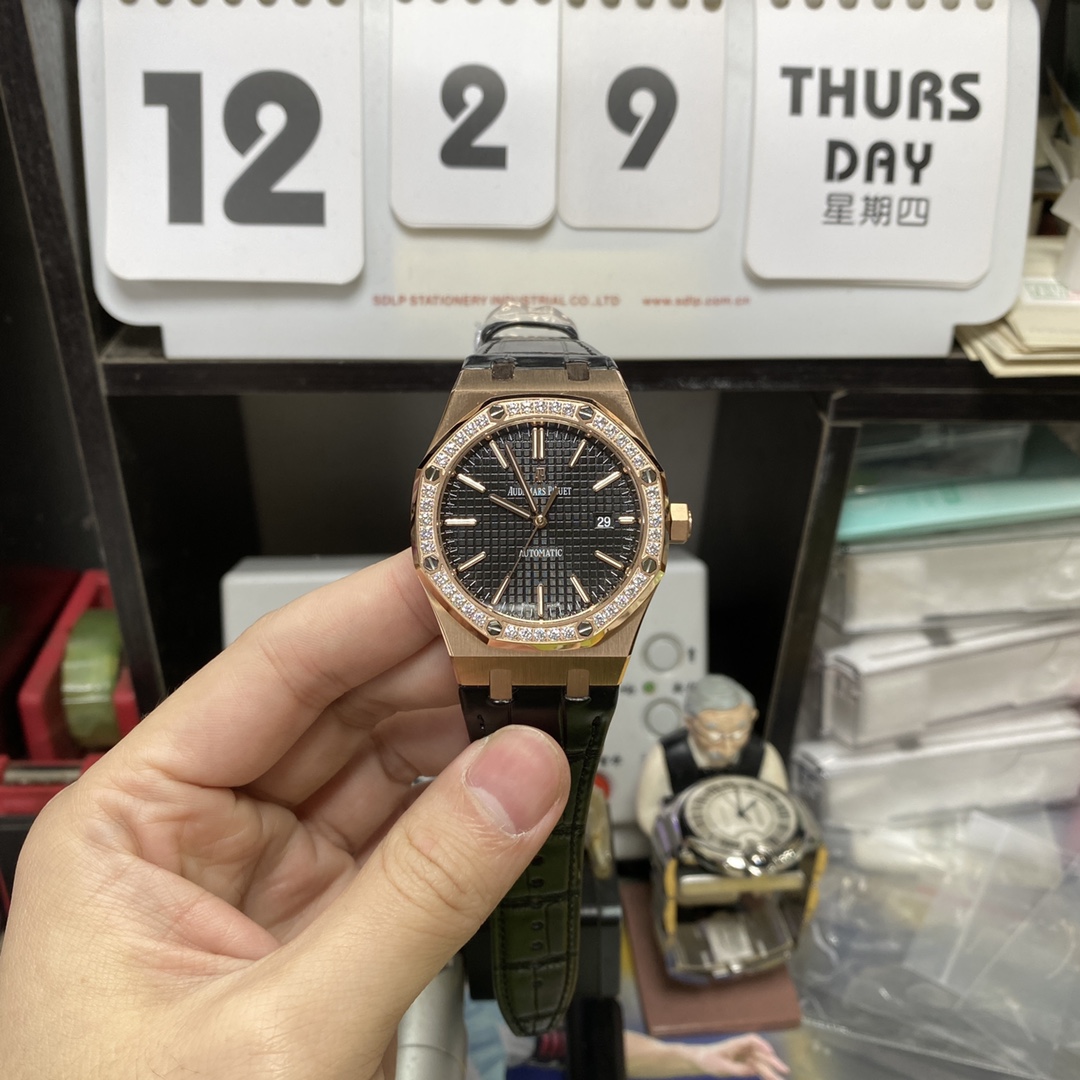 Audemars Piguet Royal Oak Series 15400OR, Rose Gold Case with Diamond Bezel, Black Dial, Leather StrapBasic Information: