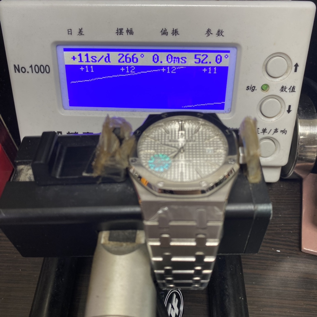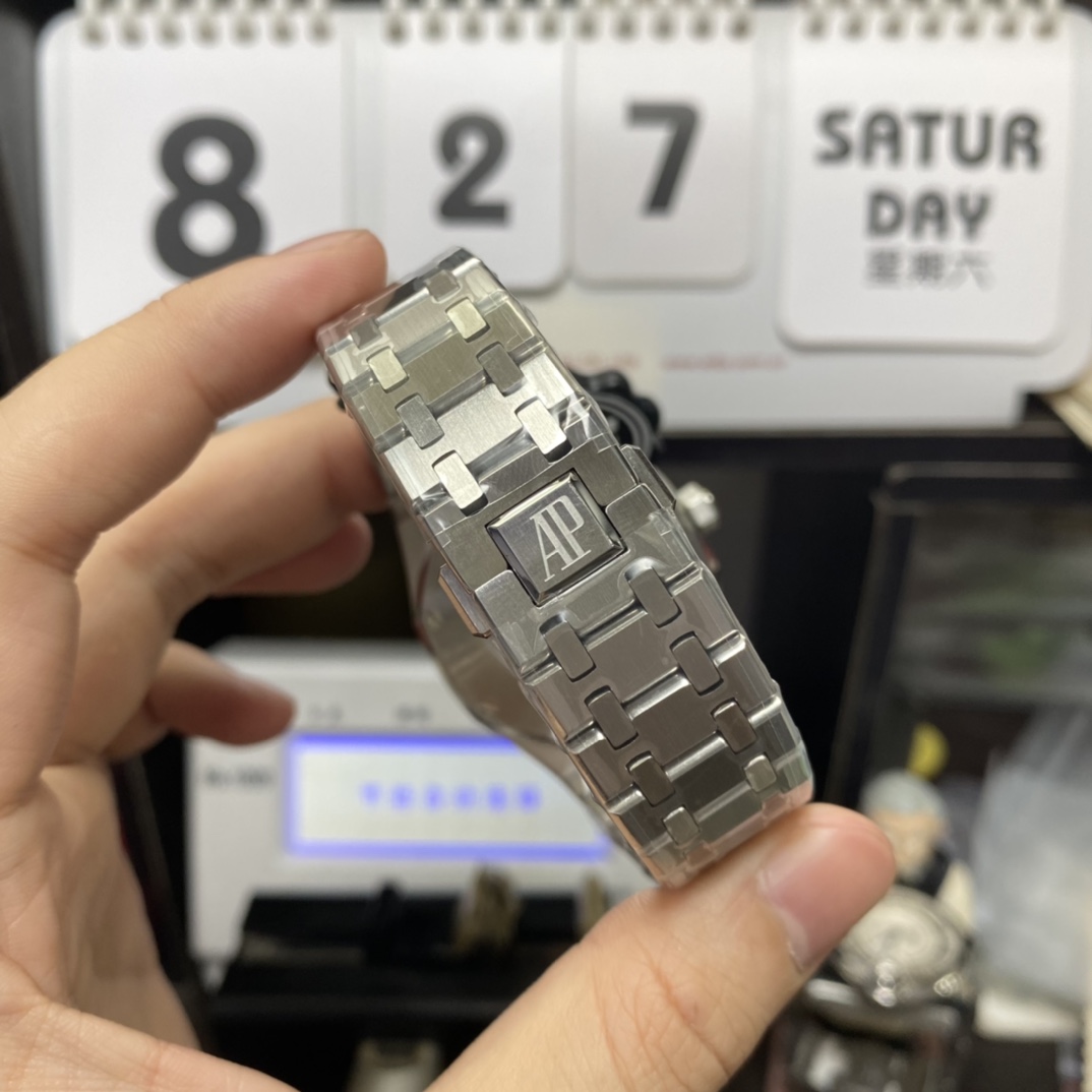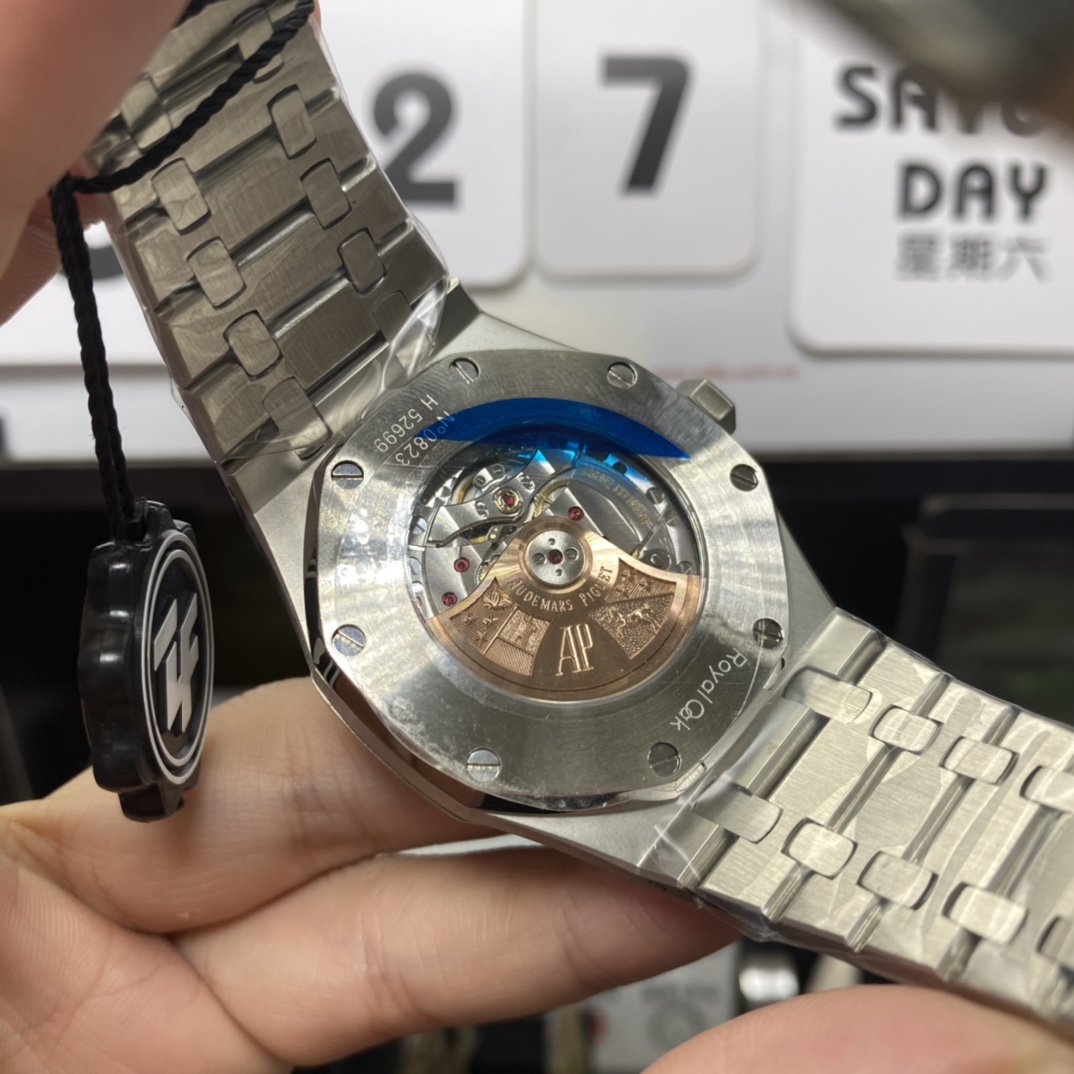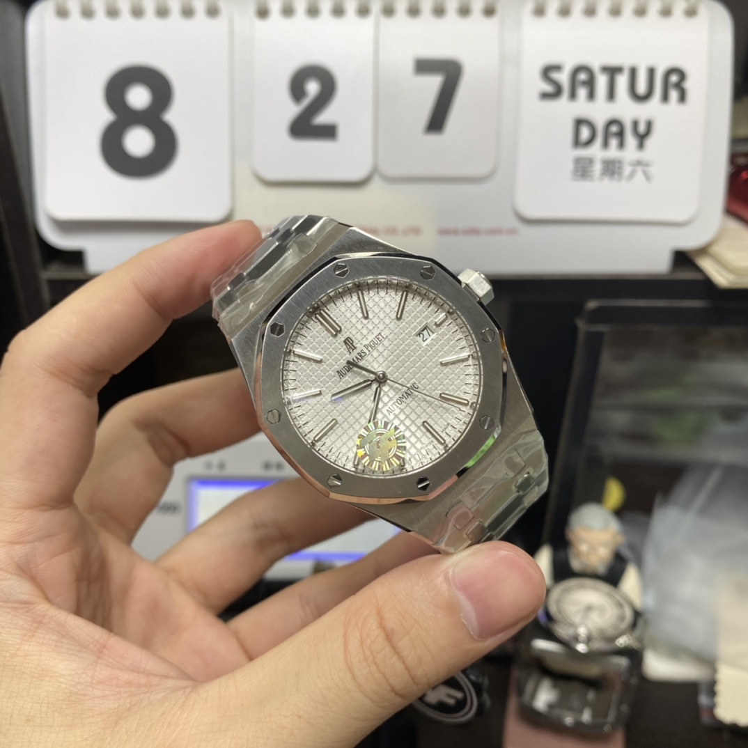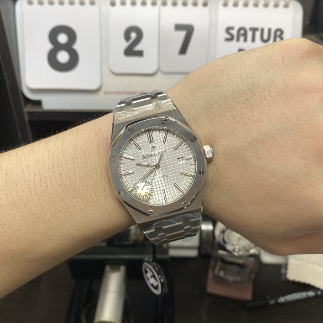 ·Dial Material: Silver dial with Grande Tapisserie large grid pattern decoration, luminescent white gold applied hour-markers, and Royal Oak luminescent hands.