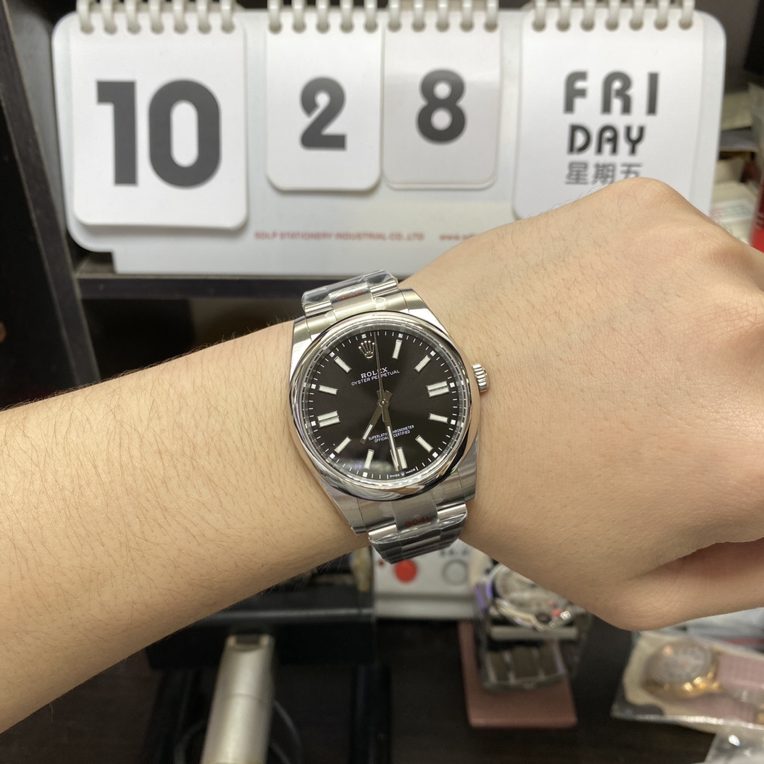 • Rolex Oyster Perpetual series m124300-0002, Black Dial with Stick Indexes, 41mm size.